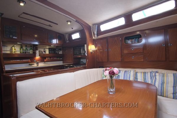 The upgraded aft cabin, featuring a large double and spare adult size bed, is also carpeted. All beds have coconut sub mattresses and all bedding is fitted by Amel supplier 'Victoria Yachting'.
