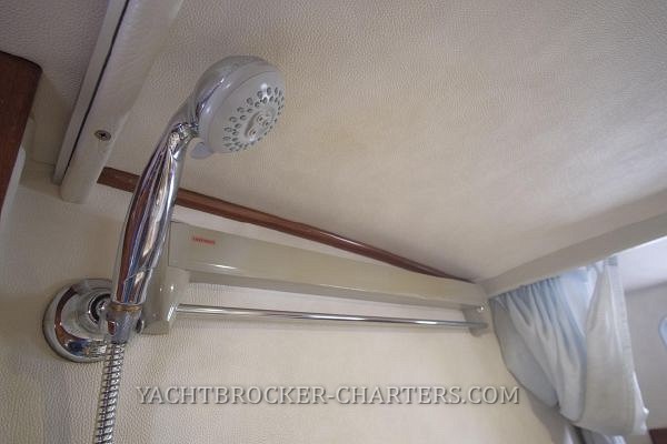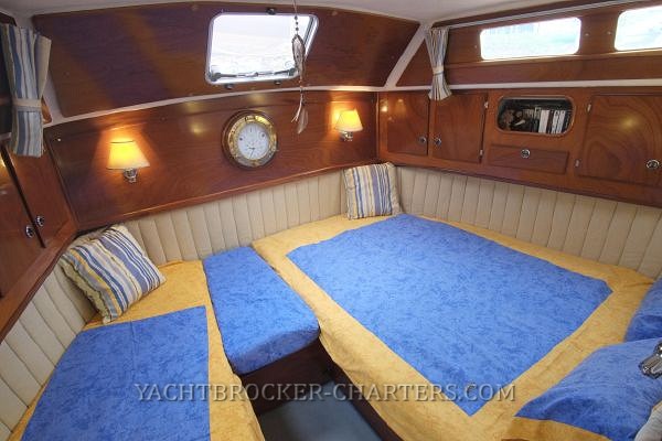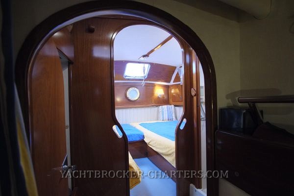 These yachts boast two generous sized cabins fore and aft, each with an identical sized bathroom. The forward guest double has two single berths, drop down writing desk and plenty of secure locker space. Provision is made to extend the port side berth to a double, retaining the single berth opposite. The cabin is yet more comfortable with soft blue carpeting.