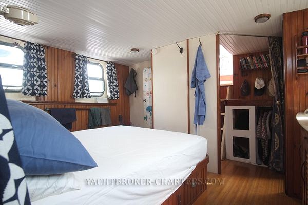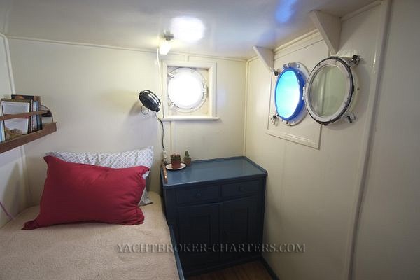 The interior of SINDBAD has been converted beautifully, offering a most elegant and traditional feel to life aboard such a vessel. The 15' x 18' central 'alfresco' deck of the boat is the focal point of outdoor life, with a varnished mahogany table and ten deck chairs complete with cover and drop downs for total enclosure at times. Cabins are fore and aft of here. One large en-suite cabin forward has a queen size walk around, a generous bathroom with separate shower and head, marble counter top and sink. Eight large opening bronze ports, laminated bamboo sole and white deckhead add beautifully to the mix. Entry to the vessel's cargo hold is from this cabin and that space is vast with multiple options for future conversion.