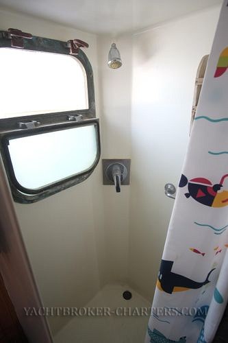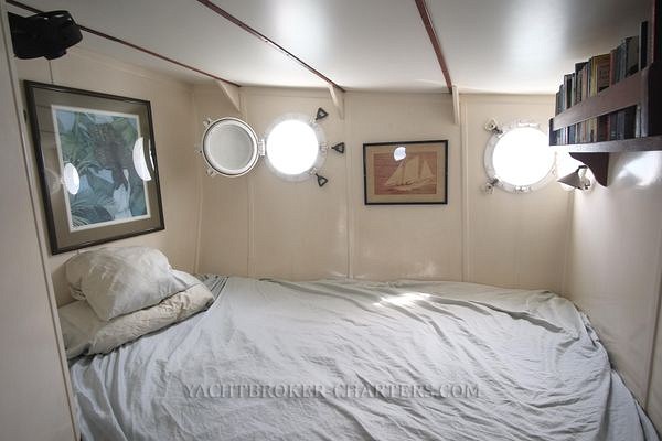 Full forward on deck takes you to the fo'c'sle cabin. This is a beautiful spot with its own head up on deck. It features a queen size double, one single berth, two settees, table and sink. Two large opening ports.