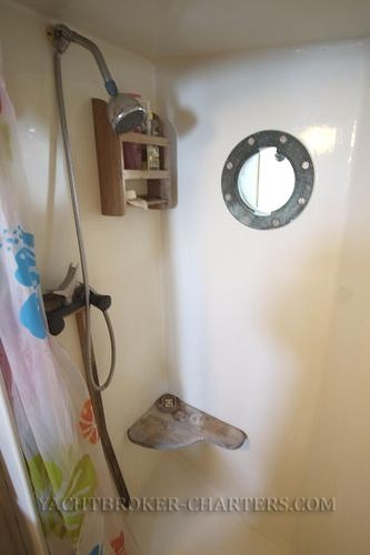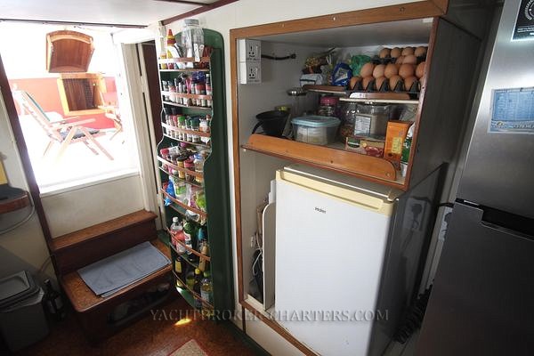 A very functional and attractive galley with four opening ports. An upright 230VAC HAIER fridge/freezer, separate HAIER freezer, VIKING HD 4 burner stove and oven, teak galley table /settee plus two chairs, cork floors, corian countertop and large enamel sinks. Excellent cupboard and drawer space c/w much kitchenware, tableware and utensils.