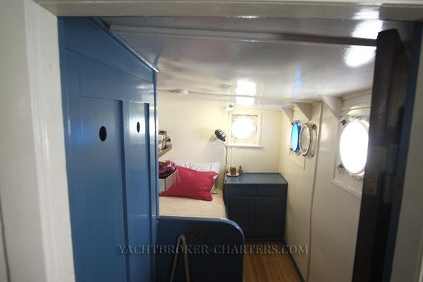 Moving back to the 'alfresco' deck brings us to a door on the port side into the aft section plus teak ladders up each side to the wheelhouse and poop deck. Entering the door takes us into the large galley, another great focal point for SINDBAD. In the galley there are steps up to the wheelhouse and a door into the aft cabin. The main aft cabin features a large teak desk, mahogany bookshelves and wardrobe and a double berth adjoined, port side. The blue cabin, as it's called, is a single berth cabin forward to starboard.