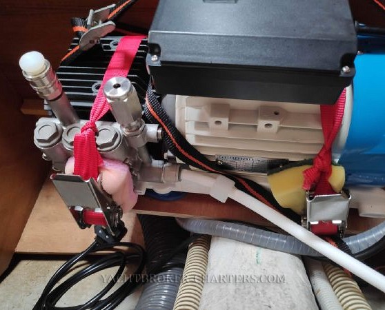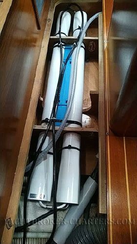 The yacht's AC system is 240VAC, shore power inlet and distribution. The yacht's DC system is 12VDC. 2 x 300 watt inverters. 1 x 3000 watt pure sinewave inverter (6000 watts peak performance)