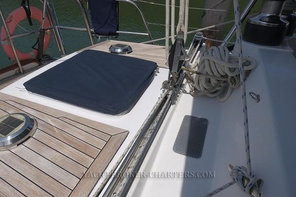 Working aft, a large bow locker is found which houses the chain and bow thruster. The hatch lid is assisted by a gas shock for ease of opening and the frame is guttered with 2 overboard drains. Hinges are countersunk into the teak to provide pain free operation. Storage for fenders, hoses, lines and the lexan storm covers for all glass surfaces can be found here. This space is wired with 12V lighting and power and weatherproof 110V. The staysail stay is mounted here. This is detachable should one wish to do so. It is stowed on the starboard side clear of the fore deck.