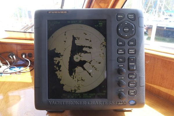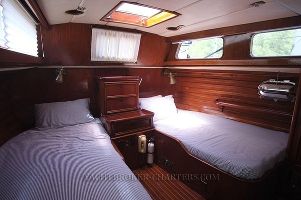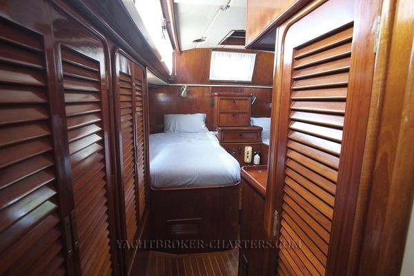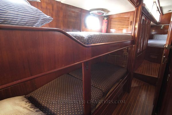 Proceeding aft, passing the engine room, one passes through the aft cabin door where inboard, a stacked full size washer dryer combination is located next to a full height hanging cupboard. Outboard under the side decks are two laundry cupboards and two large hanging lockers. All have automatic lights and cedar lining. Twin berths port and starboard are separated by a chest of drawers / nightstand upon which is mounted an airphone. Sleeping comfort is enhanced by bowed springs beneath one mattress. Lee cloths are fitted on both bunks. Custom brass reading lights are at the head of each bunk and bookshelves are outboard. Next to the port bunk, a Furuno RD-33 multifunction display is mounted. Alarms can be set or information checked with a touch of a button. Two opening ports with deadlights and a large overhead hatch ventilate this space. 5 large windows give ample light. Forward on the centreline is a vanity desk with mirror and four drawers. Another hanging locker is to port prior to entering the aft head.