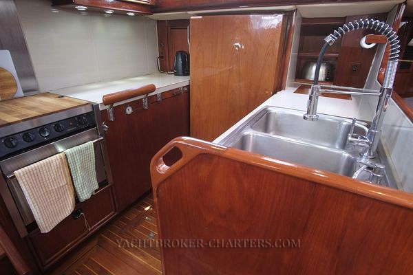 Descending down 6 steps of sensible, safe gradient you enter a large open galley and salon. Three of the steps are hinged to provide storage space.
