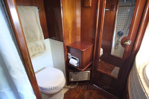 The ensuite aft head is forward and to port. Outboard a china basin and faucet are set into the vanity. The tiled countertop and splash back are sealed with contrasting grout. An electric toilet is situated inboard with teak toilet paper holder storage bin and electric heater. A full length mirror is on the rear of the door. Storage space is available under the vanity top. Forward and one step down is the massive shower stall / half bath. This area has an inbuilt seat as well.