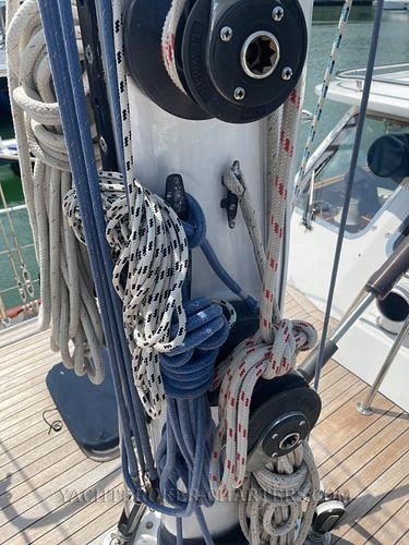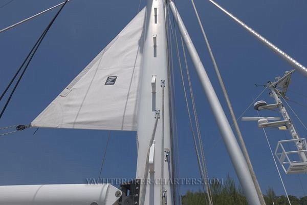 Sail area is 1300 sq feet. The rig is supported by 12mm and 10mm 1 X 19 stainless steel continuous wire rope with fore and aft lowers, single continuous upper cap shrouds. There are twin backstays with outboard chainplates allowing access to the transom steps. (Rigging new in 2019) A NAVTEC hydraulic pump, gauge and selector are mounted on the steering pedestal and tension hydraulic backstays, boom vang and staysail stay. The staysail stay is easily removed for inshore sailing by releasing the hydraulic ram.