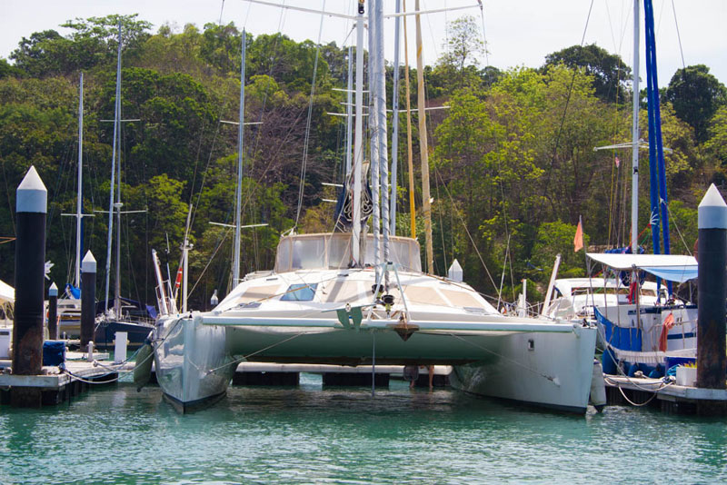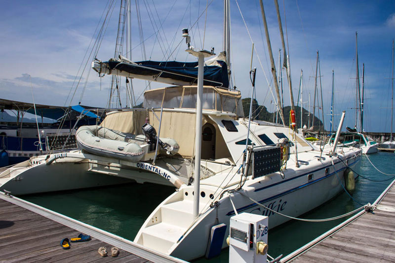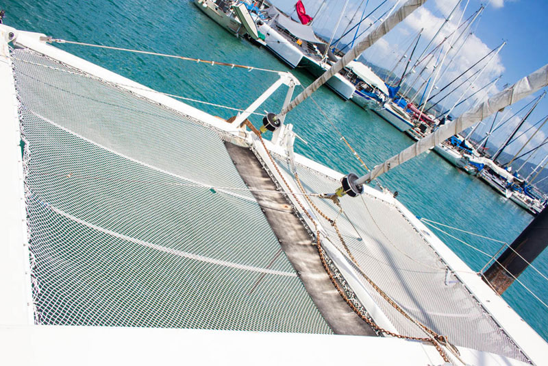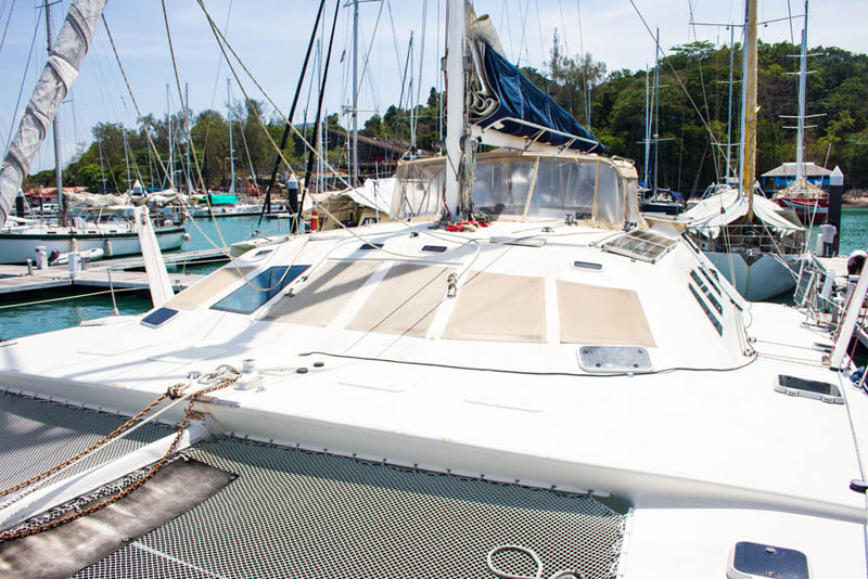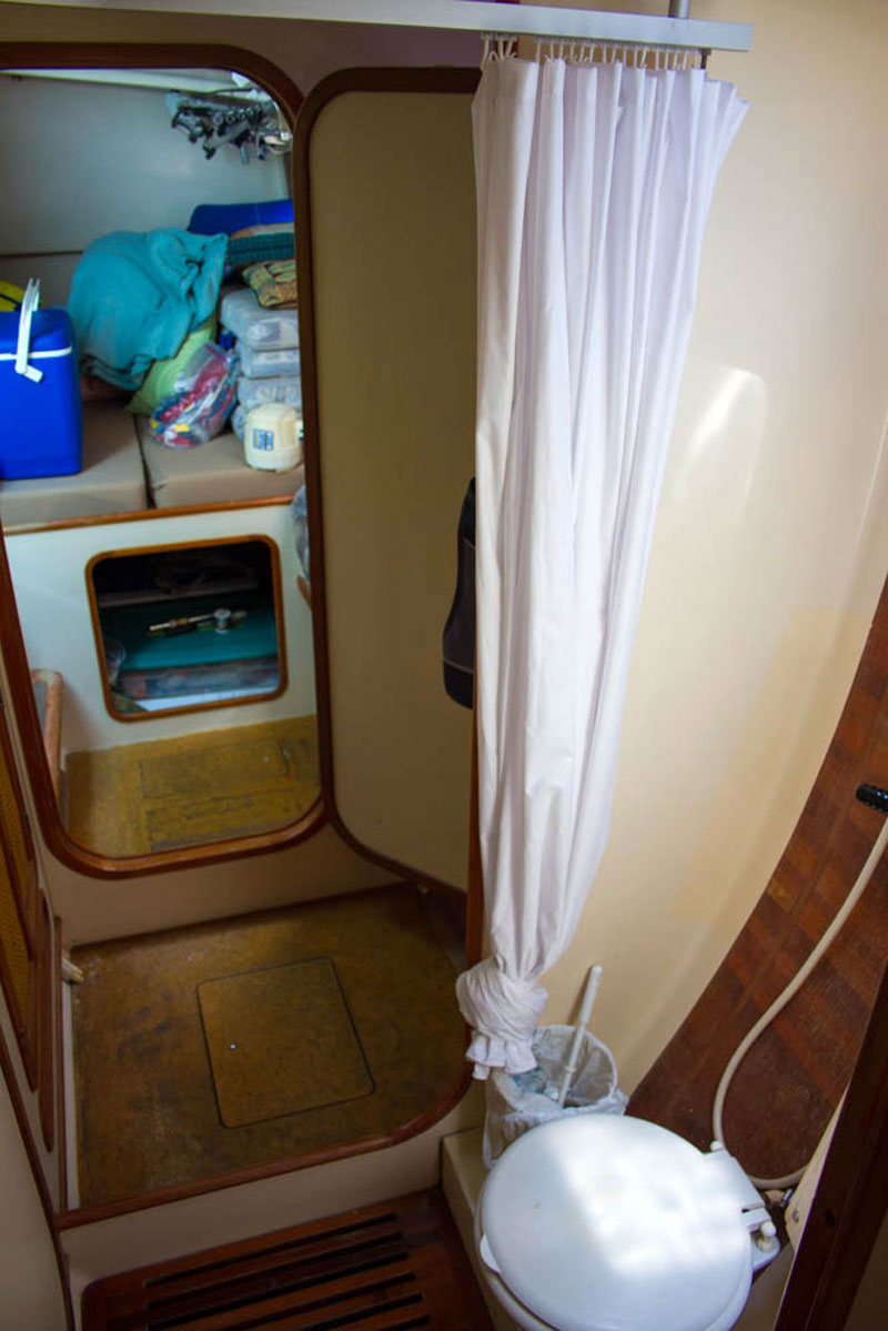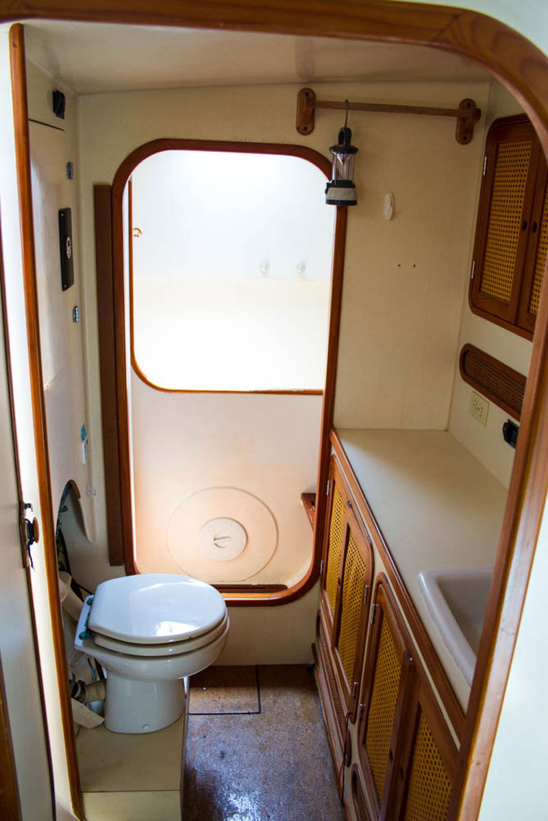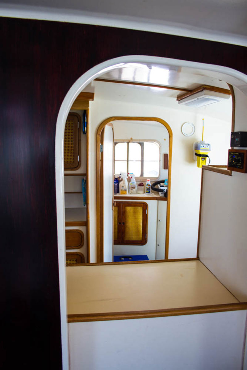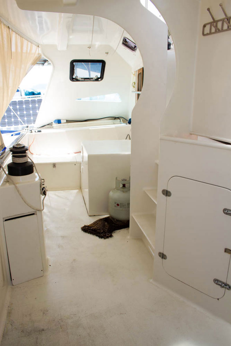 The port hull features a double cabin forward, with attached workspace, and a double cabin aft which features a second, private companionway that leads to a work and storage space located behind the galley. Starboard, we have the owner's cabin with private bathroom and several large compartments, including hanging lockers, shelving and cupboards which provide an incredible amount of storage space and room to move.