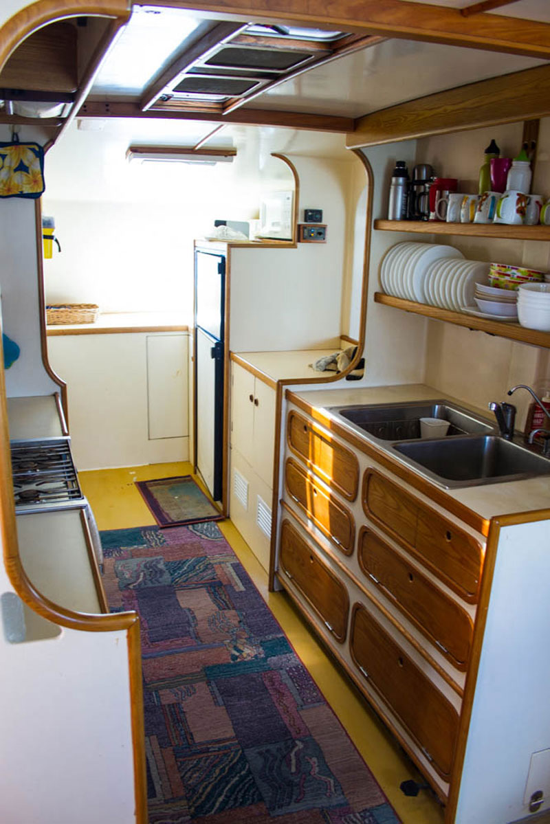 Galley is immediately to port on entry to the boat. It features a three burner gas stove/oven and a Domedic combination refridgerator/freezer that was installed in Australia in 2008.