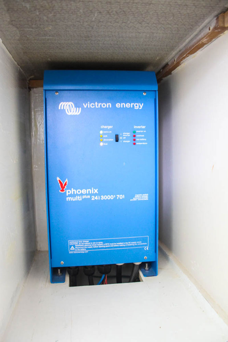 The boat has both 24v & 12v systems running, with heavy electrical devices drawing from the 24v system. There are two invertors, a Vectron Multiplus 3000kw/7amp invertor/charger and a secondary invertor used to power the DVD, monitor and printer. Power points and 12v sockets are available throughout the boat.