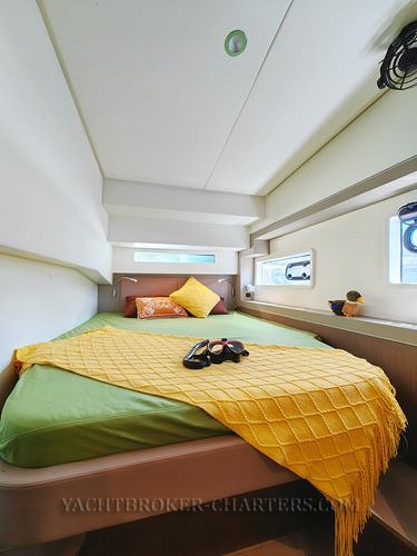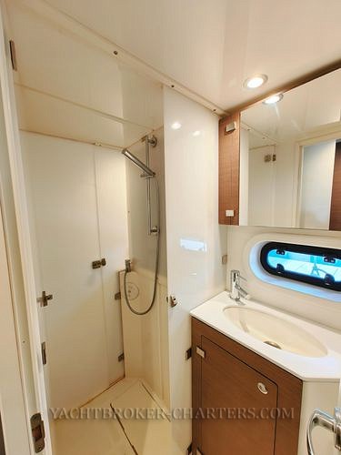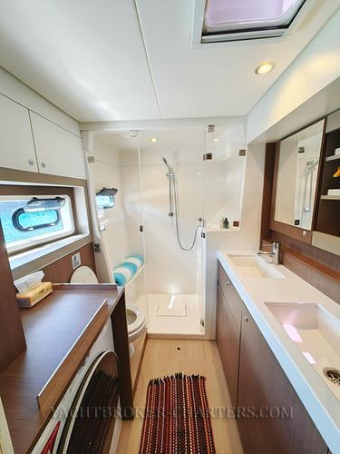 The starboard hull accommodates two comfortable guest cabins, each with its own private head. Although the heads are separate, both heads have a door leading to the same shared shower room. Throughout the yacht, the interiors are bright and airy, thanks to panoramic windows and excellent ventilation. Additionally, the yacht is equipped with air conditioning to ensure a comfortable climate throughout.