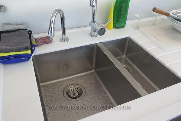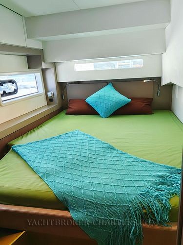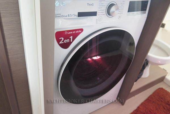This yacht offers an exceptional level of comfort with a thoughtfully designed layout, perfect for long passages or liveaboard life. The port hull is dedicated entirely to the owner’s suite, featuring a spacious cabin with a large island bed, ample storage, and generous natural light through multiple windows. The suite also includes a full-sized private bathroom with a separate shower, and a washing machine is conveniently located in the bathroom, providing additional comfort and convenience for long stays on board, offering a luxurious onboard experience.