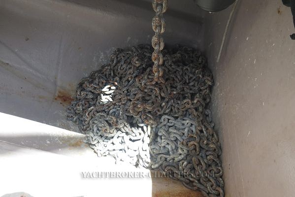 The yacht's AC system is 230 VAC, shore power inlet and cabin outlets.