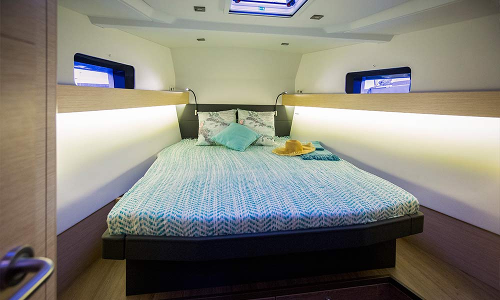 The "Duo" chart table, the vast saloon that transforms into a huge double bed for watchkeeping or friends come to visit, the galley with Corian worktop and multiple storage spaces, everything has been designed for the blue water cruising. The aesthetics have not overtaken function however, even the exquisite, demonstrating the full talent of the Darnet Design team. Further forward, the three versions of the owner's cabin, each available with a double berth or a mobile "twin" berth, will certainly meet your expectations. Finally, behind the engine compartment, which is very easily accessed, a large bathroom with separate shower is in front of the traditional and essential technical room, which is also accessible from the cockpit via a large opening panel. Unless you have opted for the three-cabin version, in which case your VIP guests will have the same cabin as on the starboard side, where storage, ample sleeping space, light and ventilation compete to know which of these criteria has won the day in the design. Safe, functional and elegant, the fittings of the Allures 45.9 are particularly adapted to life at sea. The headroom throughout, the remarkable quality, the choice of materials, the natural or artificial light, all offer an exceptional living environment.