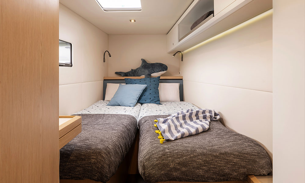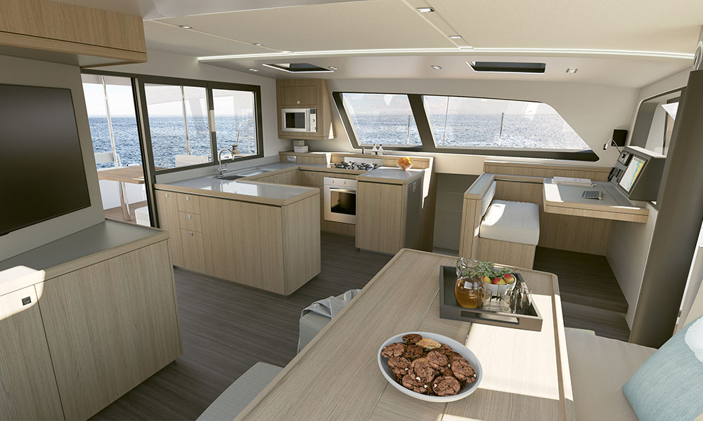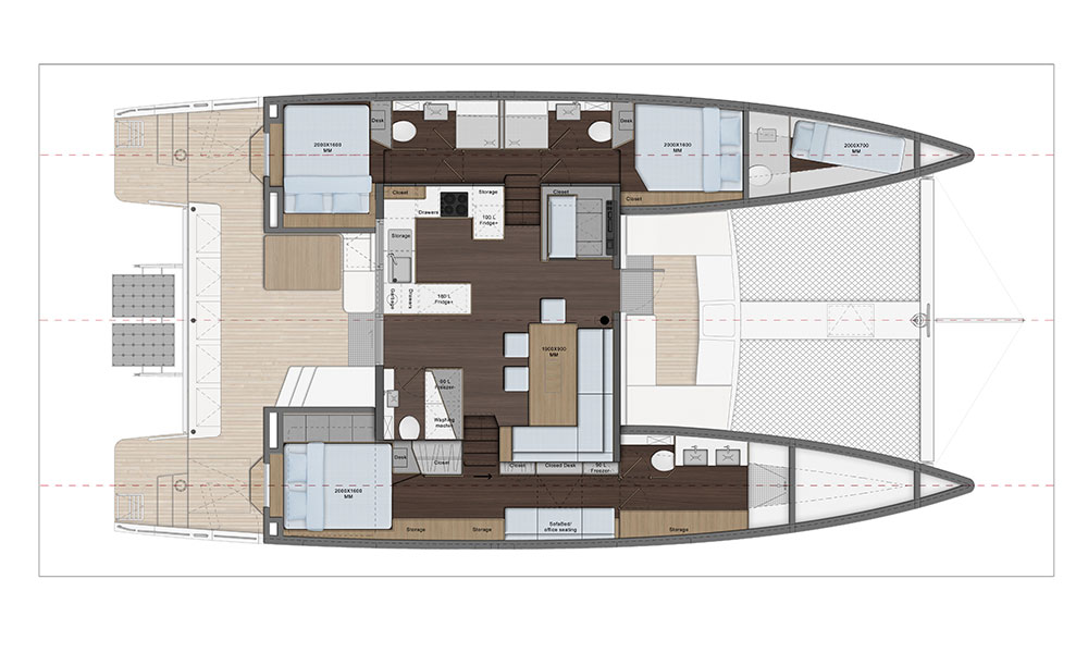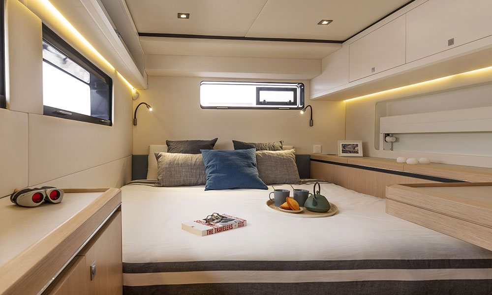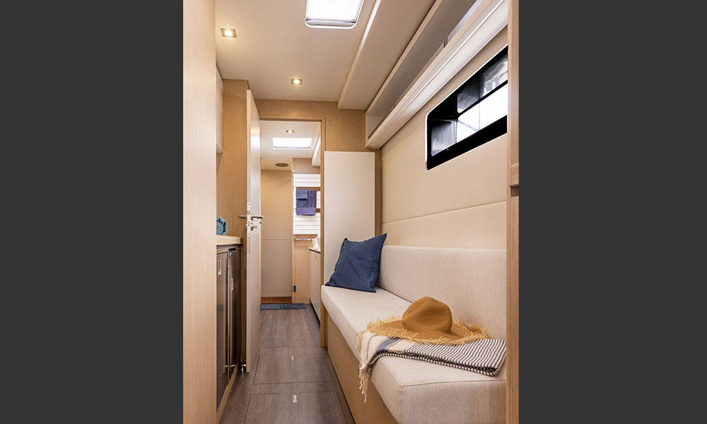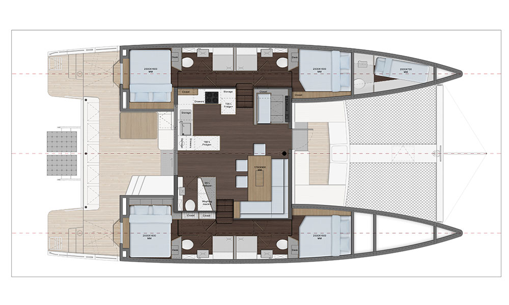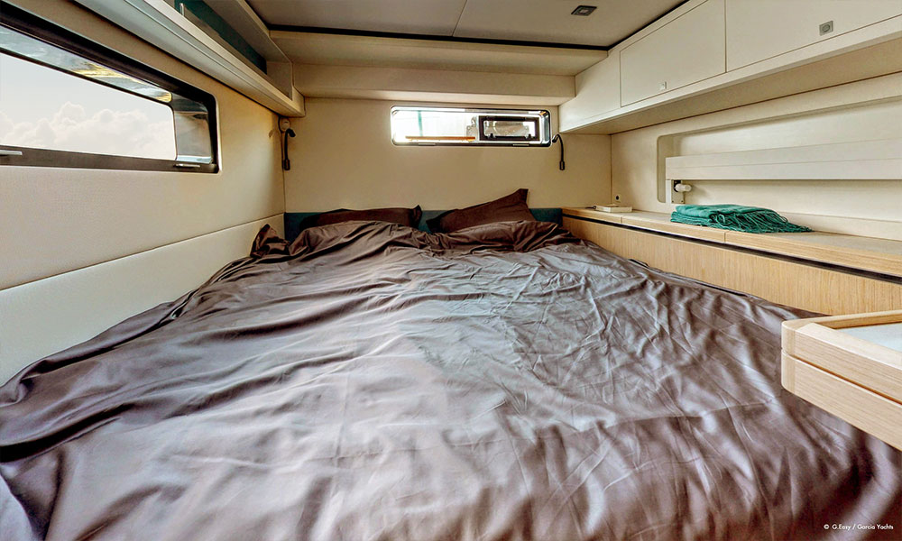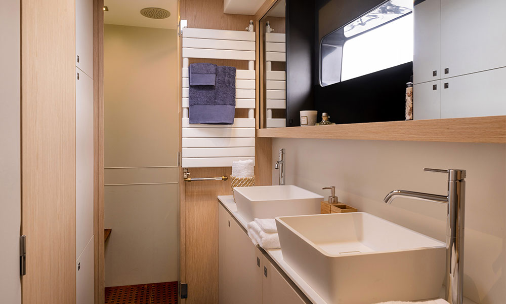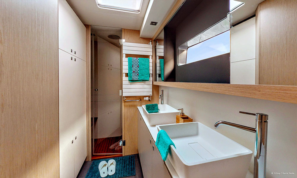 The dimensions and brightness of the saloon, galley, cabins and bathrooms, in all the configurations offered or in the one you have designed, are unparalleled. Moving around between these different private spaces, or to the outside, directly to the vast aft cockpit, or via the solid watertight door opening onto the forward cockpit, is exceptional.