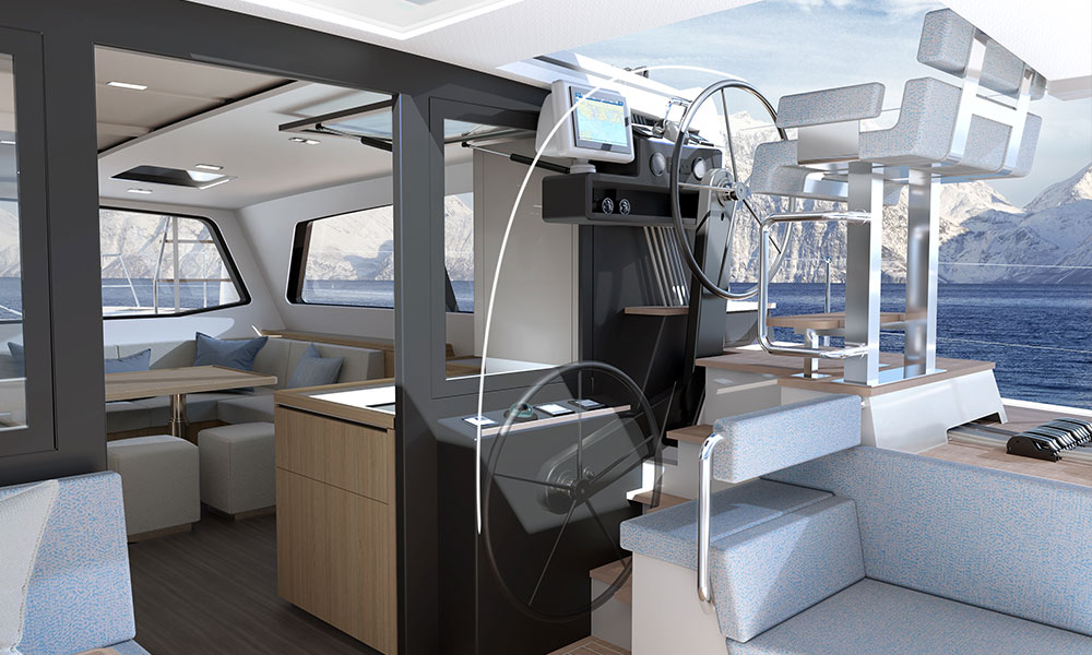 The Explocat 52’s external steering station can also be equipped with a pendulum helm system. This equipment allows you to steer either in a low position sheltered from the cockpit, or high up for manoeuvring and sailing in good weather conditions.